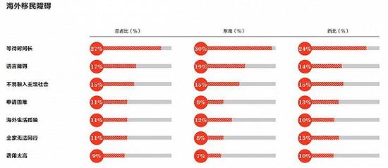 分區(qū)域來看,對(duì)于生活節(jié)奏較快的東南部地區(qū)高凈值人群來說,等待時(shí)間長(zhǎng)這一障礙更加突出,同時(shí),相對(duì)于西北部地區(qū),語言障礙和海外生活孤獨(dú)也更為凸顯。而相對(duì)于東南部地區(qū),申請(qǐng)困難、全家無法同行和費(fèi)用太高的障礙對(duì)于西北部地區(qū)高凈值人群來說更加明顯。