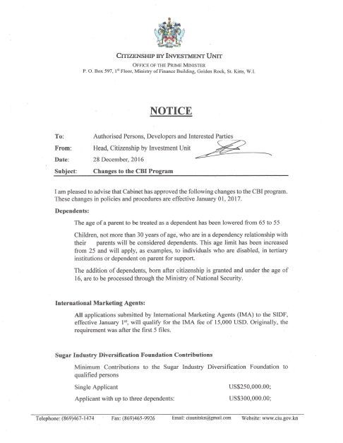 導(dǎo)讀:據(jù)悉,圣基茨移民局發(fā)布關(guān)于圣基茨投資入籍政策法規(guī)修正案,且該修正案已于2017年1月1日起正式生效。