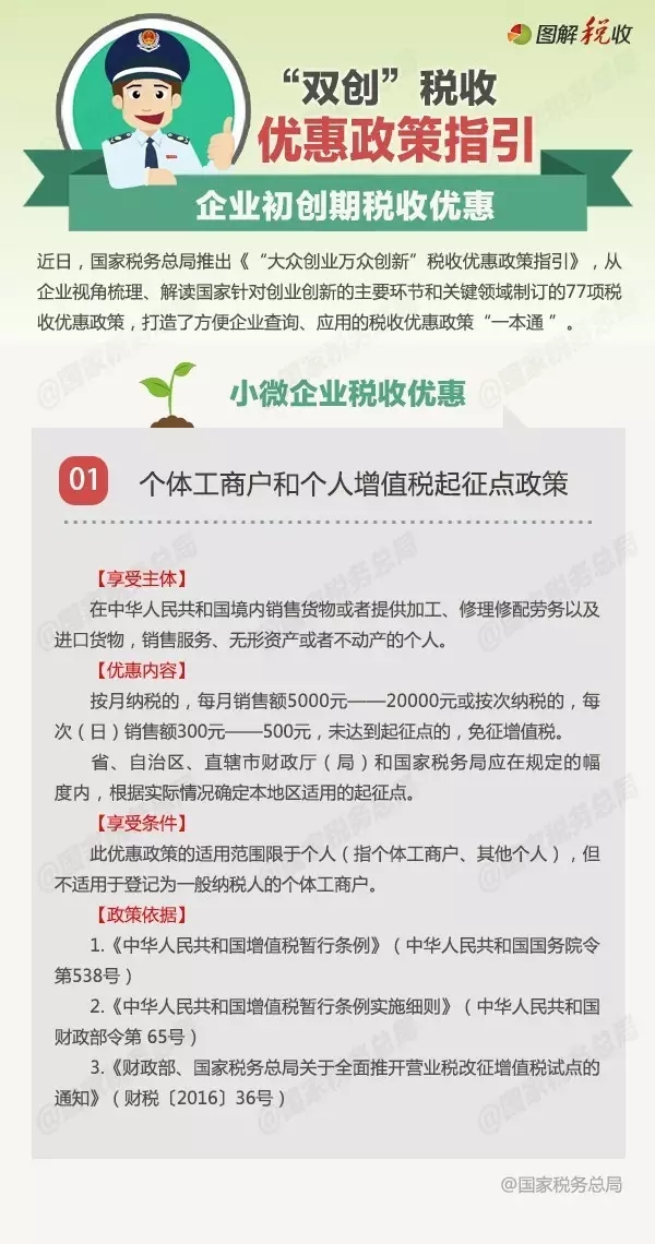 近日,國家稅務總局推出《“大眾創業萬眾創新”稅收優惠政策指引》,從企業視角梳理、解讀國家針對創業創新的主要環節和關鍵領域制訂的77項稅收優惠政策,打造了方便企業查詢、應用的稅收優惠政策“一本通 ”。從今天開始,我們將陸續編發77項稅收優惠政策的具體內容。今天發布企業初創期稅收優惠之小微企業稅收優惠政策:個體工商戶和個人增值稅起征點政策。